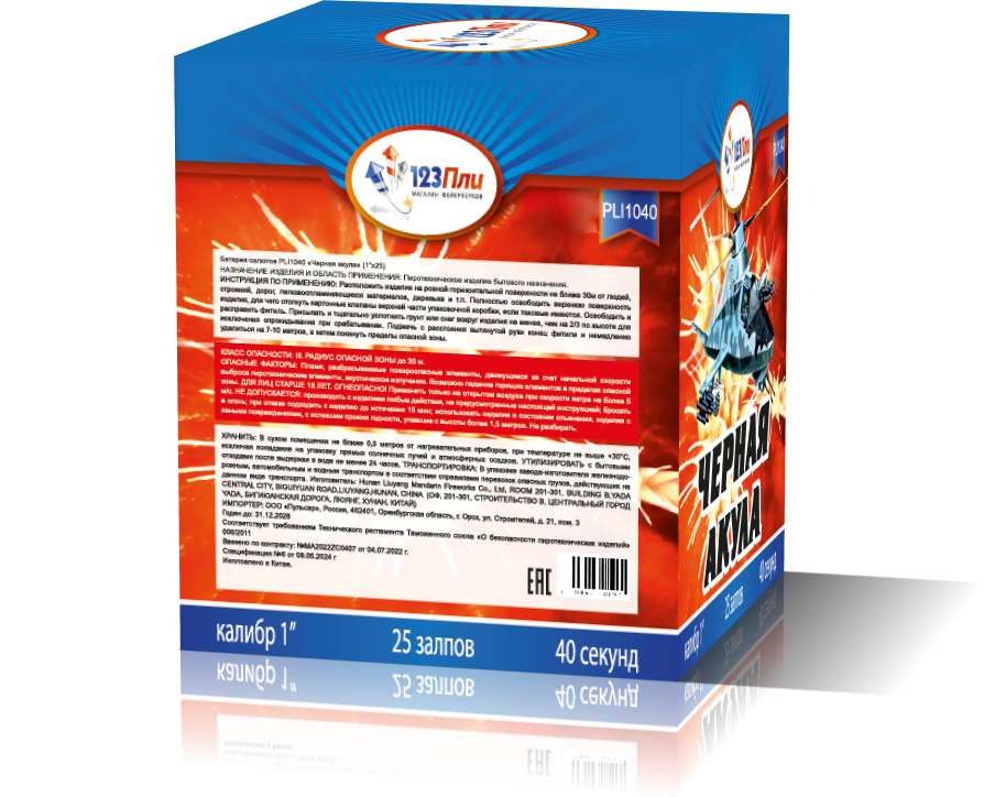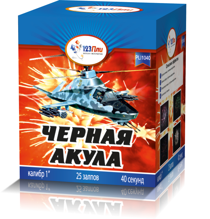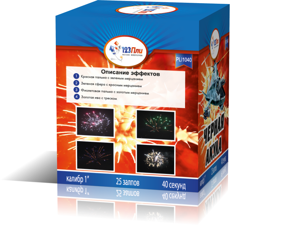 Яркий и запоминающийся салют "Черная акула" от компании "123 Пли" за время работы выстреливает один за другим множество различных многоцветных эффектов! Это совсем нескучный салют, который более чем оправдывает потраченные на него деньги! В ассортименте фейерверка "Черная акула" - красные пальмы, зеленые сферы, фиолетовые пальмы с мерцанием, золотые ивы с треском.